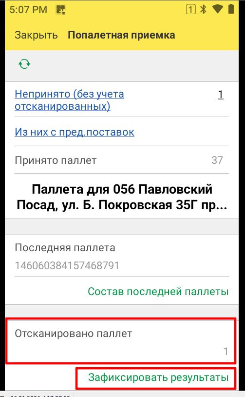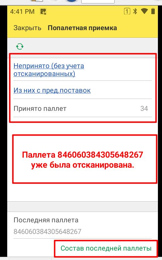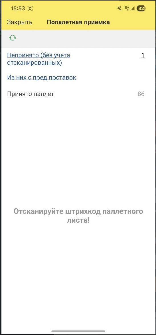 Нажимаем на кнопку Попаллетная приемка - терминал готов к приемке. Сканируем ШК паллеты. На экране отображается кол-во Непринятых, Принятых и Поставок из предыдущих поставок.