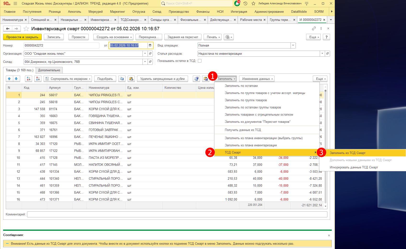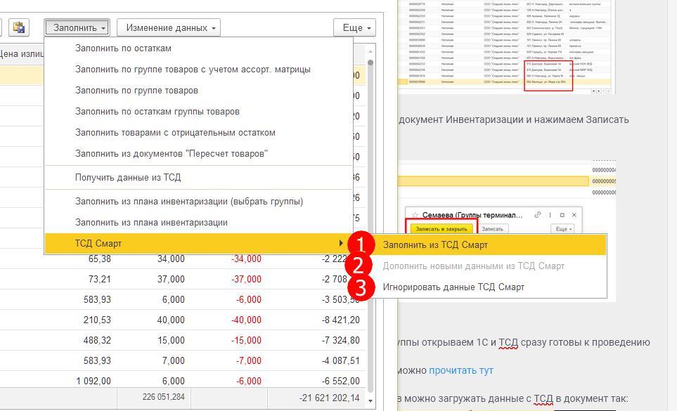 1. Заполнить из ТСД Смарт - операция заполняет значение кол-ва в документ инвентаризации в каждую строку товара, которая была сканирована на ТСД. Если в этой сроке были введены данные вручную - то такие данные будут удалены