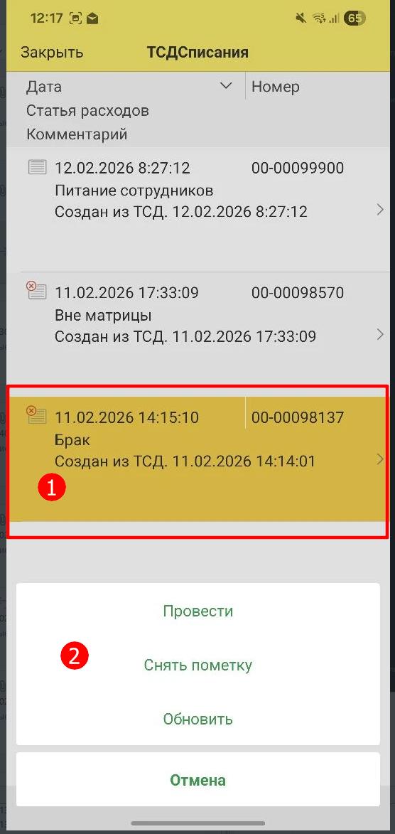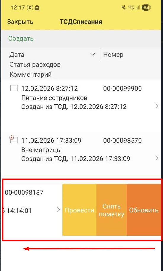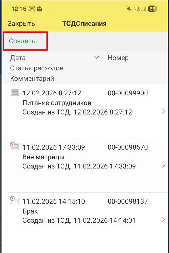 Реализована возможность проведения списания с ТСДПустой новый документ списания можно создать как в 1С так и непосредственно на ТСД