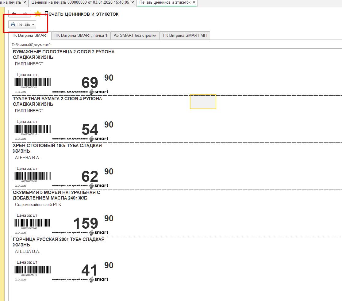 Далее печатаем ценники кнопкой Печать