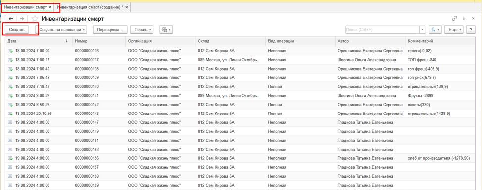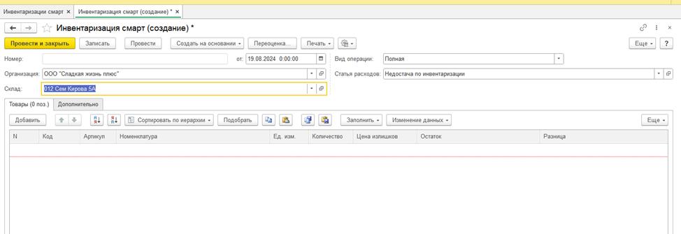 - Дата и время документа “Инвентаризация” должны быть максимально приближено к времени фактического пересчета товара.