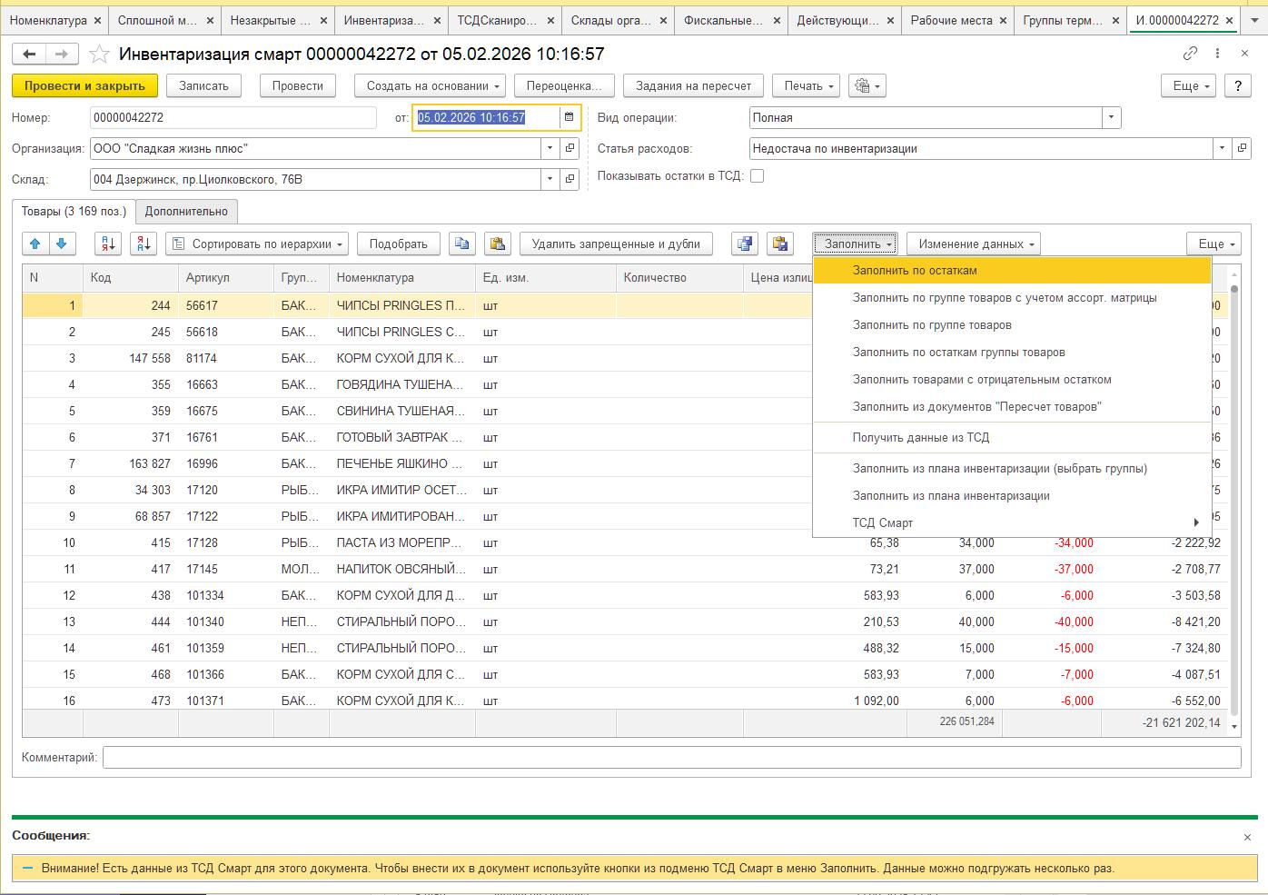 - Запрещено создавать или изменять документ Инвентаризация после закрытия касс (даже одной кассы). Результат будет некорректный: инвентаризация спишет дополнительное количество товаров (Недостача) и на магазине появятся отрицательные остатки. По той же причине запрещено первоначальное заполнение документа задним числом после закрытия кассовой смены на любой из касс.