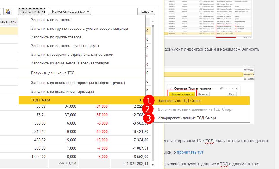 2. Дополнить новыми данными из ТСД. Операция добавит новые сканированные данные, которые еще не загружались в документ по команде из меню №1. Данные по одинаковым товарам будут сложены.