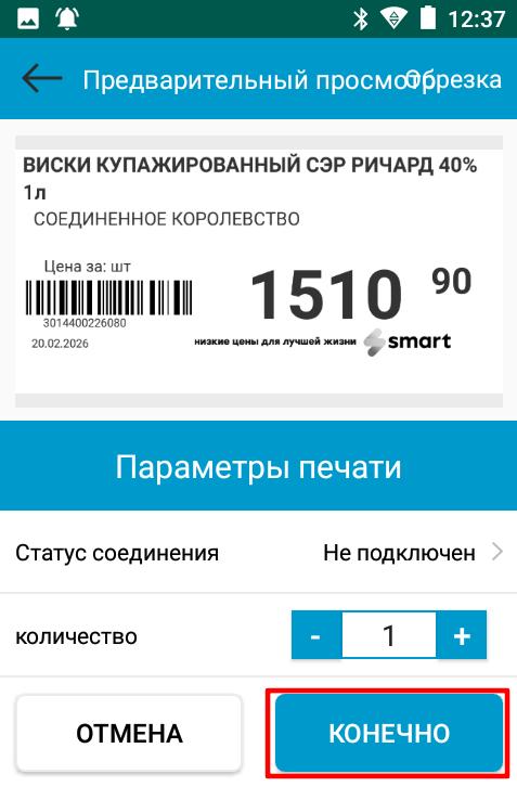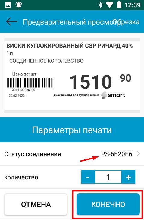 10. Выбранный принтер должен появиться в "Статус соединения", затем нажимаем "конечно" и наблюдаем печать ценника: